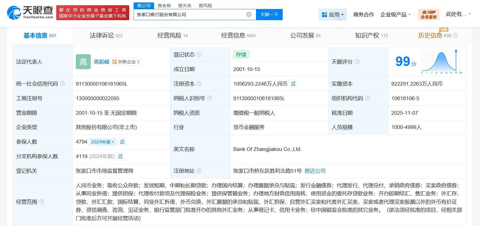 每经AI快讯,天眼查工商信息显示,近日,张家口银行股份有限公司发生工商变更,注册资本由约92.2亿元增至约105.6亿元,增幅约14.5%。该公司成立于2001年10月,法定代表人为高毅峰,经营范围含人民币业务,吸收公众存款,发放短期、中期和长期贷款,办理国内结算,办理票据承兑与贴现,发行金融债券,代理发行、代理兑付、承销政府债券等。股东信息显示,该公司由张家口市张融城市信用合作社、张家口市明德城市信用社合作社、秦皇岛中方能源有限公司等共同持股。