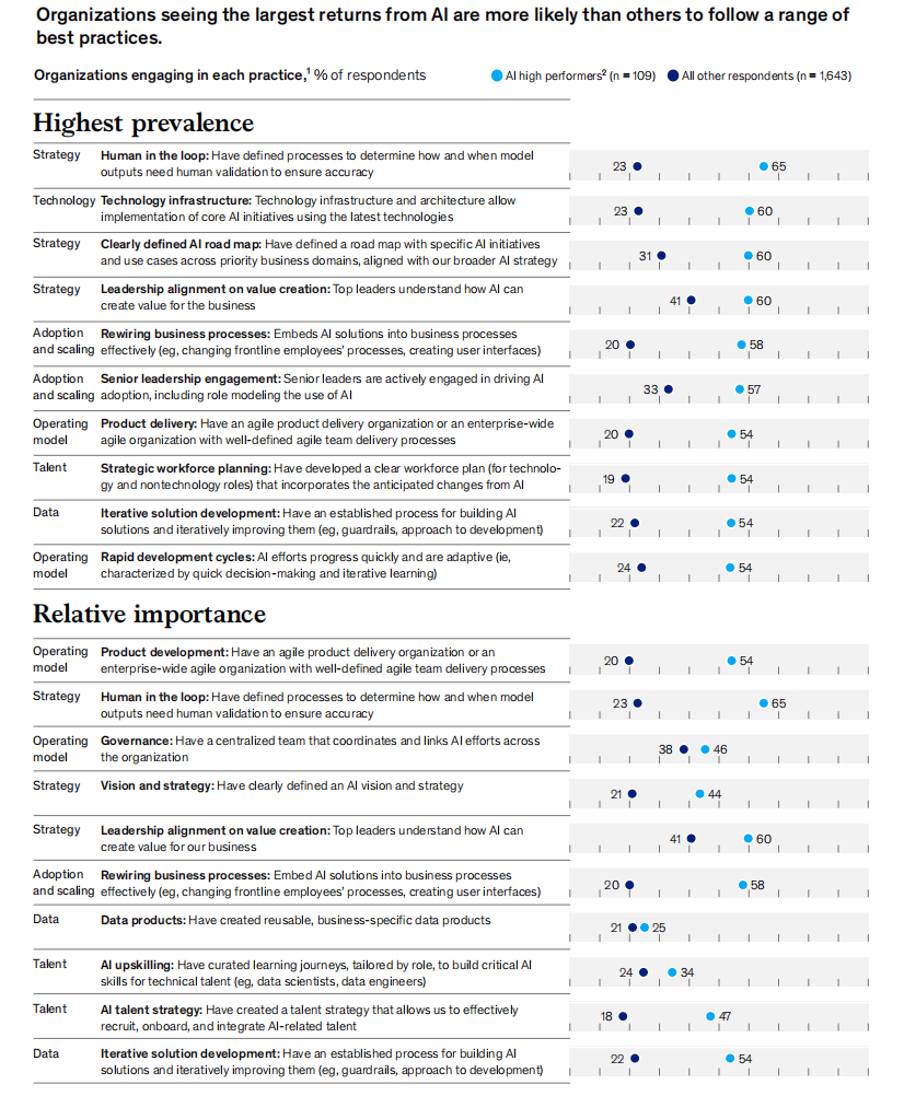 比如,在战略层面,高绩效企业中有60%已绘制明确的AI路线图(一般企业的一半)。