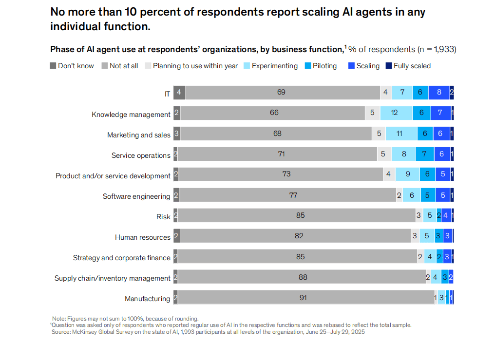 也正因如此,麦肯锡在报告中反复强调,Agent热度虽高,但还远未量产。多数组织目前还在试用或“验证阶段,离规模化还有一段距离。