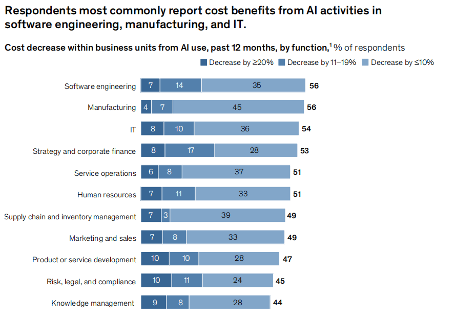 例如软件工程、制造、IT这类以效率提效为核心的岗位更容易吃到红利,而营销、战略、财务则是为数不多能带来“营收提升”的领域: