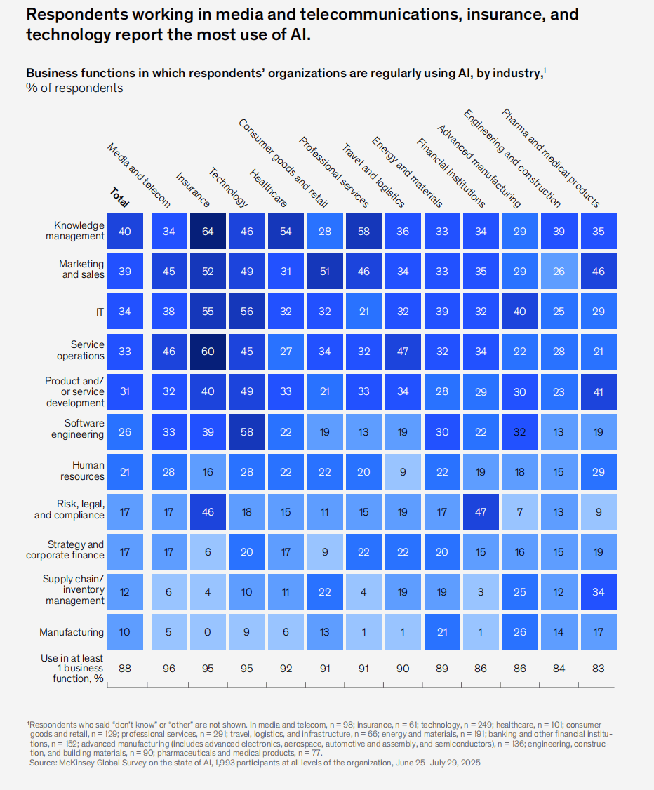 88%的受访企业表示已在至少一个业务职能中使用AI技术,比去年整整高出了10个百分点。