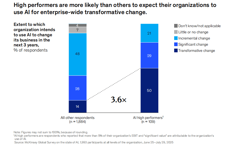 未来3年,有50%的高绩效企业打算推动AI主导的“变革性改变”,而普通企业中这一比例只有14%。