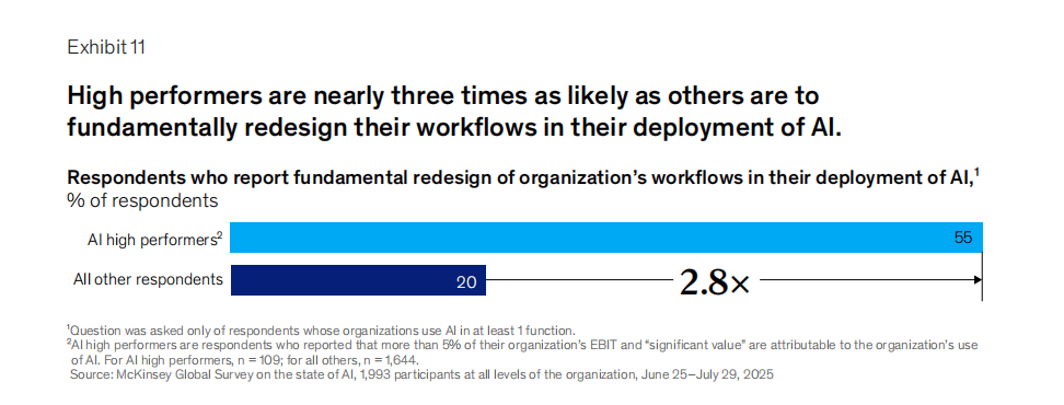 在AI真正落地的环节上,高绩效员工从从根本上重新设计工作流程的可能性高达55%,约其他人的三倍(2.8×)。