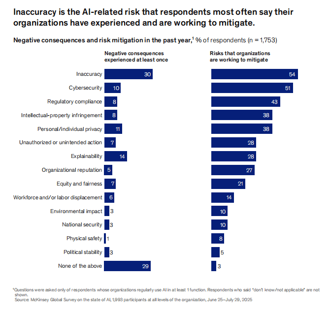 麦肯锡的调研显示,在所有AI相关的负面后果中,“结果不准确”是企业遇到最多的问题,有30%的组织在过去一年中至少遇到过一次该类风险。其次是“解释性不足”和“个人隐私问题”。