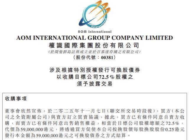 代价5900万港元,将通过发行三年期零息可换股债券支付,换股价0.25港元,较周五(11月7日)收市价溢价0.81%。
