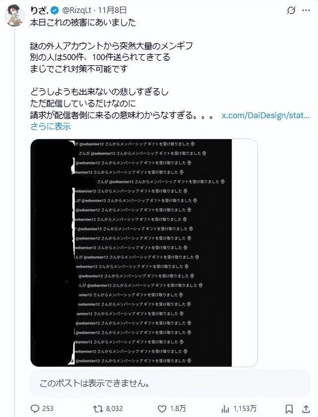 她在 X 上崩溃发帖说:“今天我遇到了這種情況。突然有個外國帳號送了一堆會員贈禮,結果被取消後,費用全算在我身上……我這個月不但沒賺錢,還倒貼開台費用。幾乎沒有任何對策,只能莫名其妙負債。”