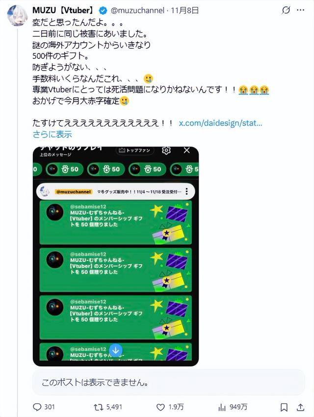 “我就覺得怪怪的!兩天前被外國帳號送了 500 份禮物!這根本防不勝防啊!對專職 VTuber 來說這是生死問題!”