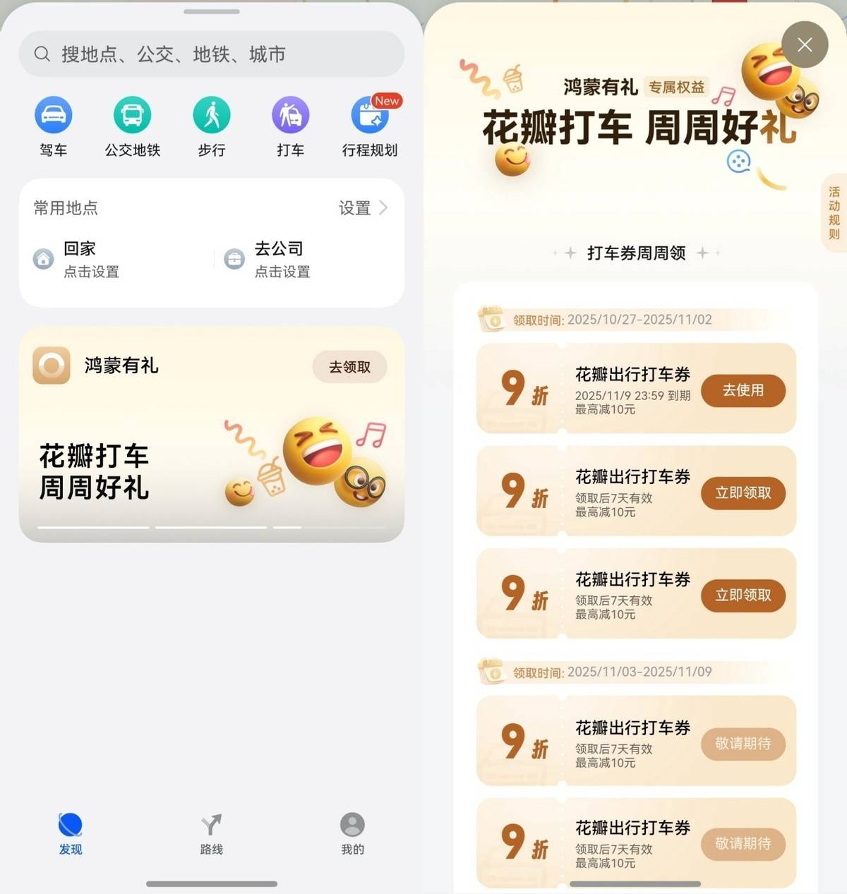 我的鸿蒙5.1省钱妙招还不止这些。比如出行,我最近最常用的,就是花瓣地图。双11期间,每周可以领三张9折打车优惠券,7天日内可用,每单最高能省10块钱,而且鸿蒙5.1的用户还可以再打折上折,真的很划算。这几天我逛街、通勤都用它打车,打车也不心疼路费了。