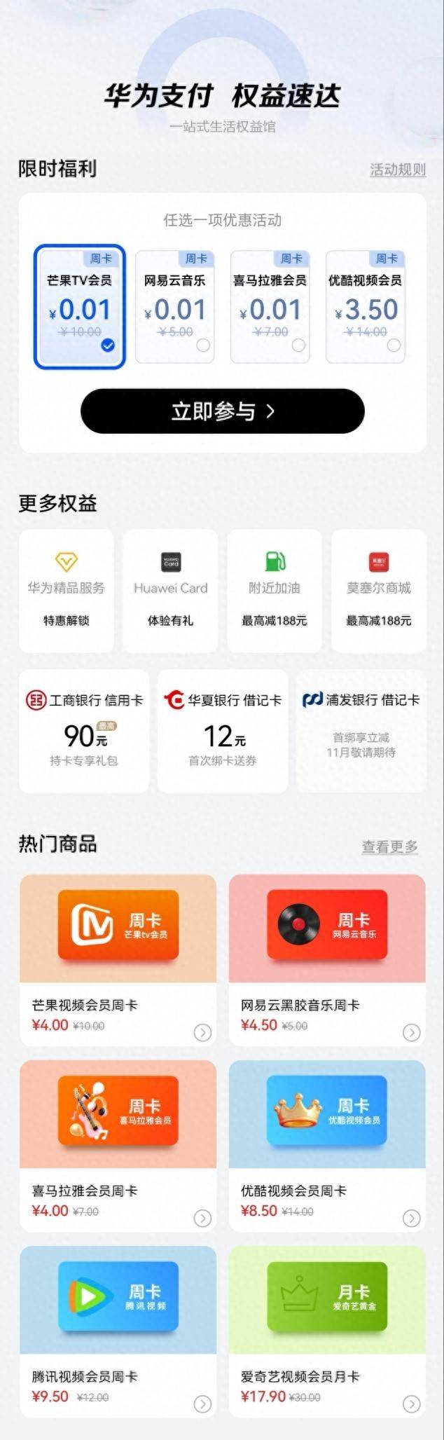 不只有娱乐福利,吃喝玩乐也都被它安排妥当。在权益馆还能领美团、高德的会员券包,不管是点外卖吃大餐,还是打车,都又省下一笔。华为支付还联合工商银行、华夏银行推出立减优惠。我在华为商城买智能手表的时候,用新绑的工行信用卡支付,就领了90元立减券包,不玩套路直接立减。直接告别烧脑算满减!从文娱到生活购物,全场景智慧支付一步到位,这波体验属实被它精准拿捏了!