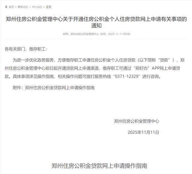 11月11日,郑州住房公积金管理中心发布关于开通住房公积金个人住房贷款网上申请有关事项的通知。