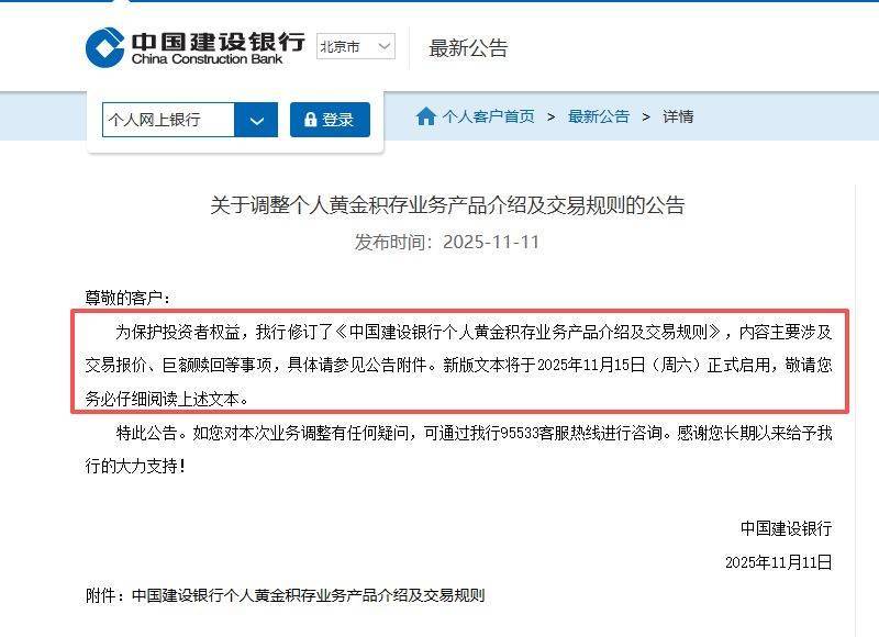 11月11日,中国建设银行发布《关于调整个人黄金积存业务产品介绍及交易规则的公告》称,为保护投资者权益,修订了《中国建设银行个人黄金积存业务产品介绍及交易规则》,内容主要涉及交易报价、巨额赎回等事项。新版文本将于2025年11月15日(周六)正式启用。
