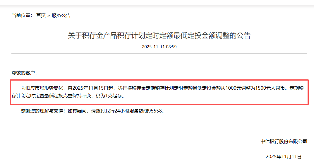11月11日,中信银行公告称,为顺应市场形势变化,自2025年11月15日起,将积存金定期积存计划定时定额最低定投金额从1000元调整为1500元人民币。定期积存计划定时定量最低定投克重保持不变,仍为1克起存。