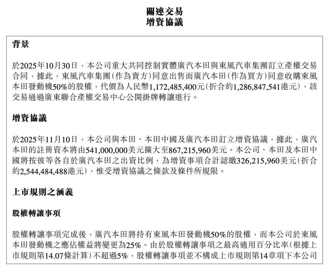 至于股东对广汽本田增资的背景,源于此前广汽本田收购东风本田发动机公司的承诺。9月30日,广汽集团发布公告,同意广汽本田收购东风汽车集团股份有限公司持有的东风本田发动机有限公司50%股权,挂牌底价为11.72亿元,资金来源为现金增资。广汽本田完成股份收购后,东风集团股份将完全退出东本发动机公司,在广汽集团对广汽本田增资后,东本发动机公司将成为广汽本田全资子公司。10月30日,广汽本田和东风汽车集团订立产权交易合同,东风汽车集团同意出售东风本田发动机50%股权,代价为人民币11.72亿元。