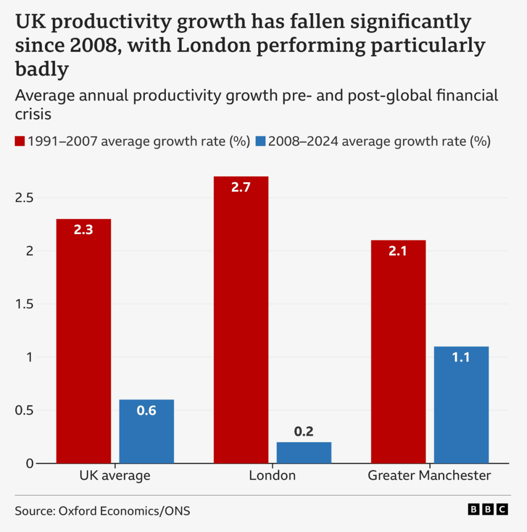 牛津经济研究院(Oxford Economics)的城市地区研究小组指出,2008年全球金融危机以来,英国的生产率表现一直低迷,伦敦及英国其他主要城市的生产率增长持续不佳,是背后的主要原因。