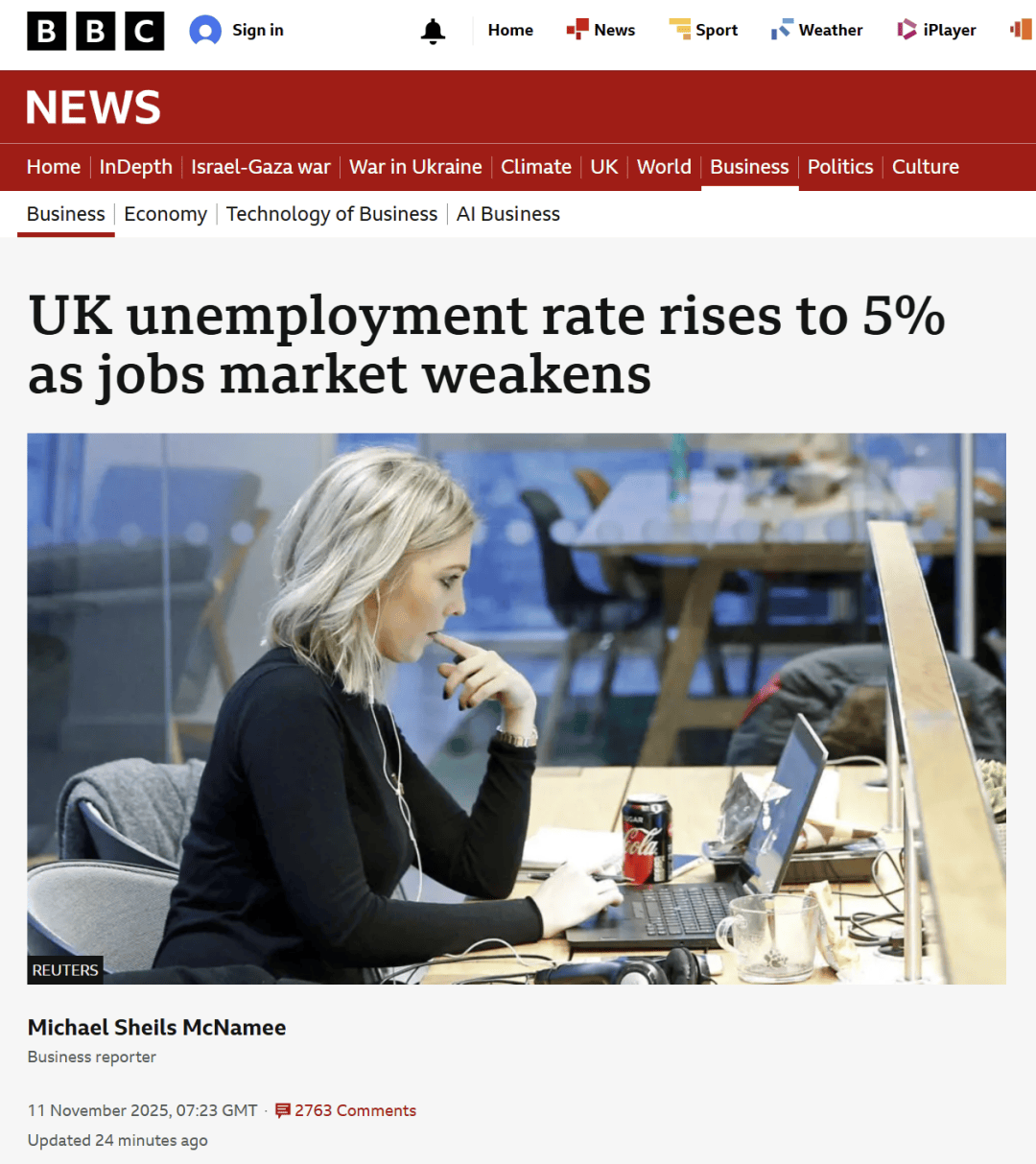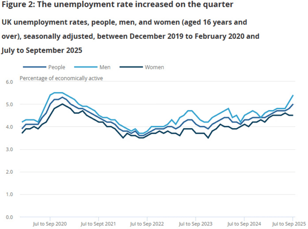 就在刚刚(11月11日),英国国家统计局(ONS)发布最新数据显示,截至今年9月的三个月内,英国失业率升至5%,为2021年2月以来的最高水平,且高于市场此前预期的4.9%。