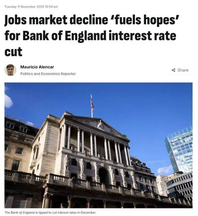 受失业率上涨影响,英国央行降息预期上升,预计下月(2025年12月)英国将再次降息,最新英镑汇率也因此应声下跌。