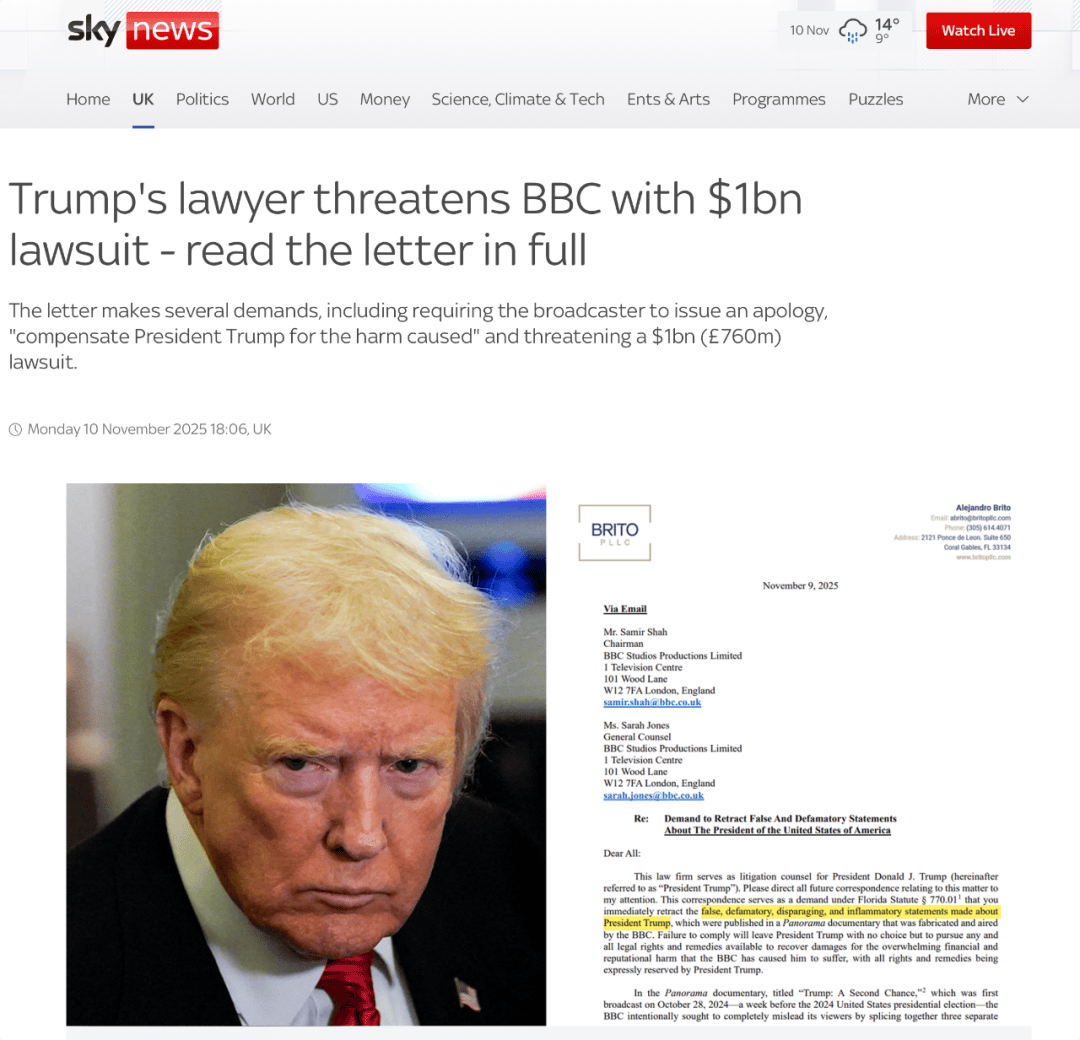 11月11日,美国总统特朗普表示,他将就BBC“恶意剪辑演讲”一事,向BBC提出控告,并索赔10亿美元。