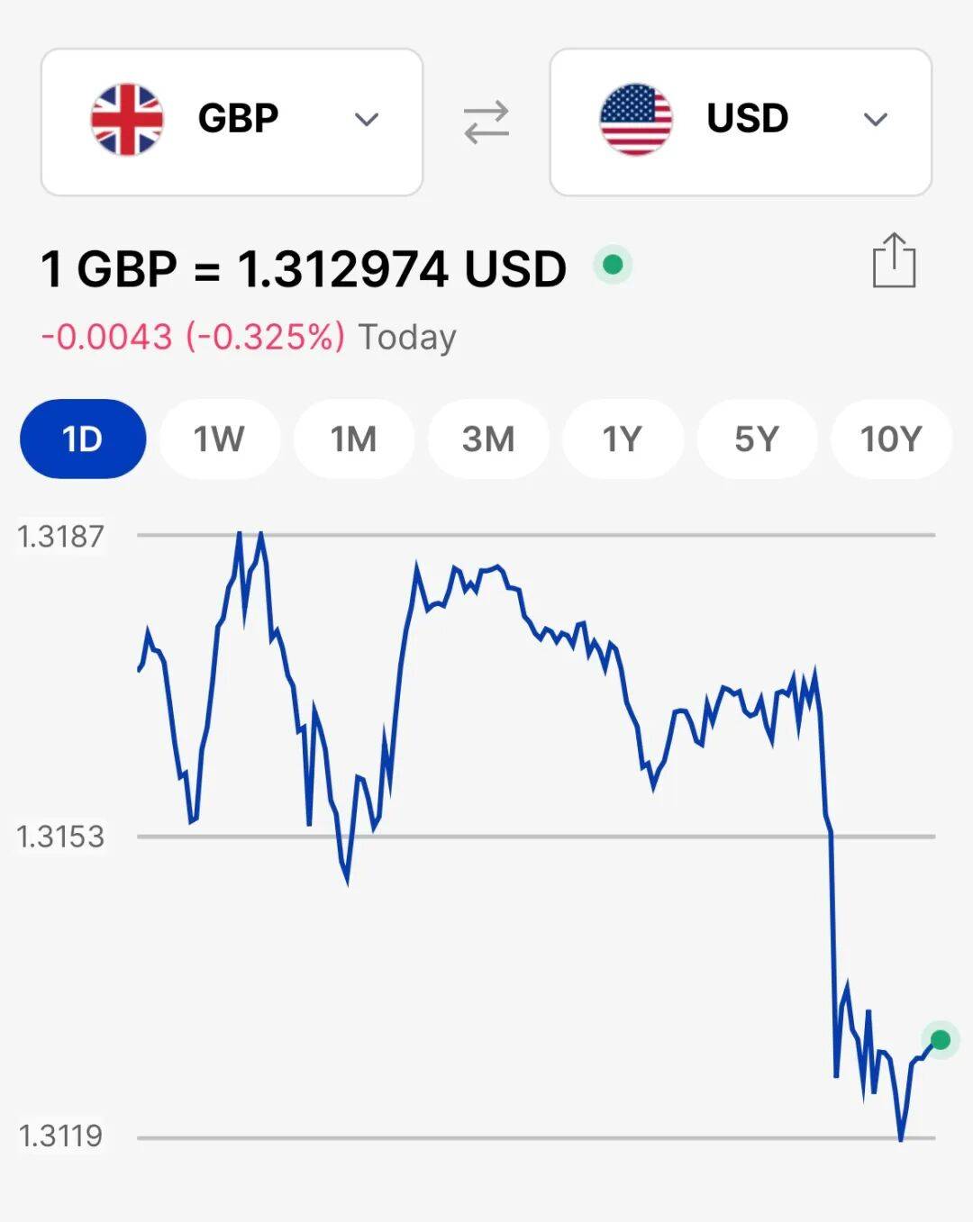 下为过去24小时英镑兑美元汇率走势,已下跌至最新的1.313。