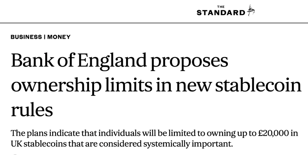 ● 英国央行提议对个人稳定币持有量设置2万英镑上限