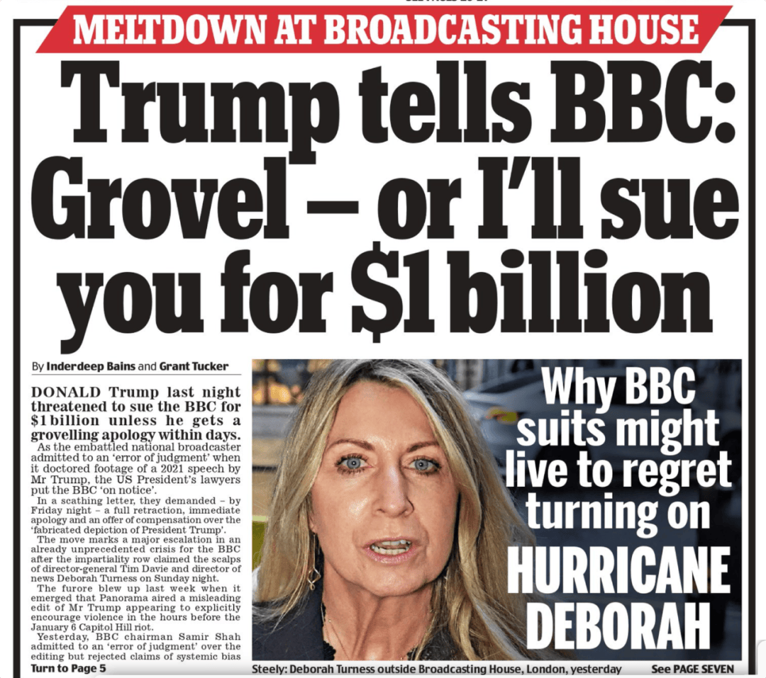 英媒获悉,特朗普的律师团队已经要求BBC在本周五晚上10点公开道歉,发表撤回有关内容的声明以及支付赔偿,否则将对BBC采取法律行动。