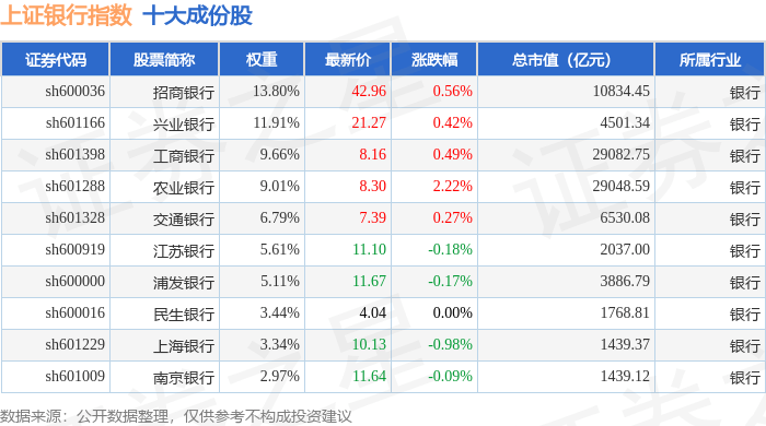 证券之星消息,11月11日,上证银行(000134)指数报收于1068.41点,涨0.35%,成交194.9亿元,换手率0.19%。当日该指数成份股中,上涨的有11家,农业银行以2.22%的涨幅领涨,下跌的有10家,上海银行以0.98%的跌幅领跌。