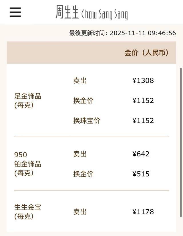 其中周大福、周生生、周大生、潮宏基、谢瑞麟足金饰品价格为1308元/克,老凤祥、老庙黄金足金饰品价格为1310元/克。