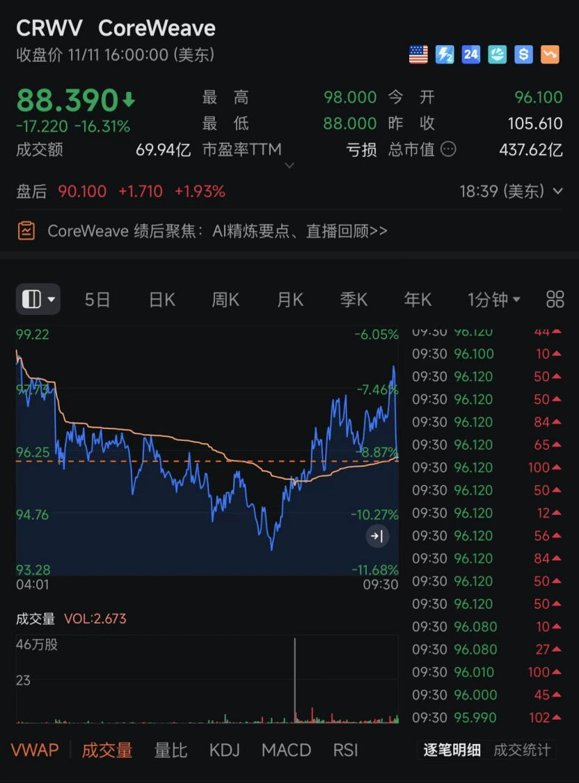 AI科技股CoreWeave 11日股价暴跌超16%。消息面上,公司下调全年营收预期,下修指引对这家在AI热潮中竞速的公司构成打击。摩根大通则将其评级从“增持”下调至“中性”。