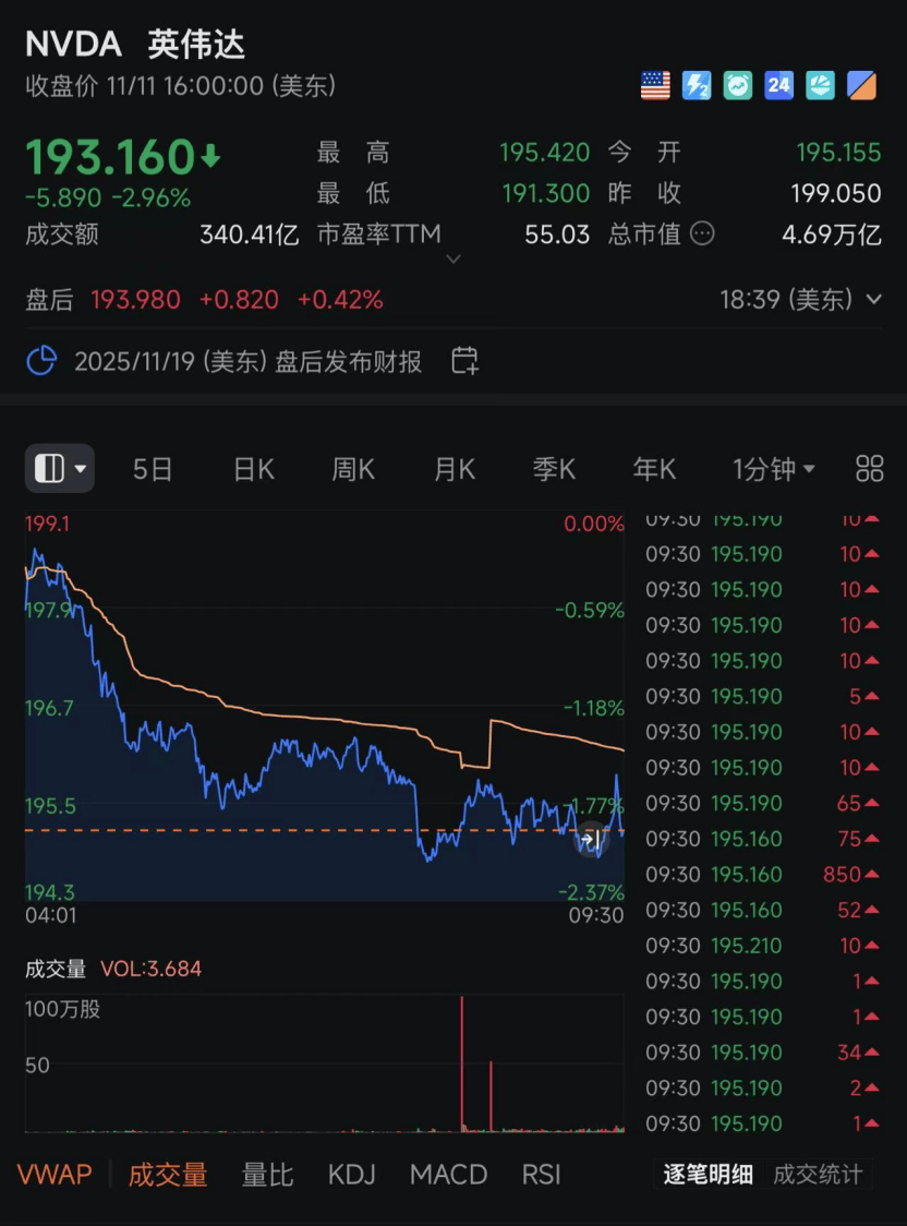 当地时间11月11日,英伟达跌近3%,公司市值一夜蒸发1431.27亿美元。而就在上月底,英伟达市值一度突破5万亿美元,成为历史上首个跨过这一门槛的公司。公司股价也在上月升破210美元/股,创历史新高。