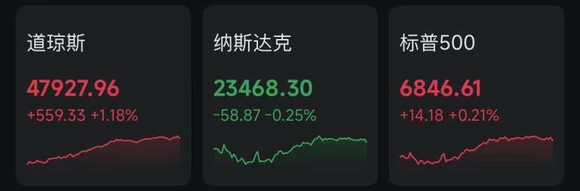 当地时间11月11日,美股三大指数涨跌不一,其中道指创历史新高。截至收盘,道指涨559.33点,涨幅1.18%,报47927.96点;纳指跌58.87点,跌幅0.25%,报23468.30点;标普500指数涨14.18点,涨幅0.21%,报6846.61点。