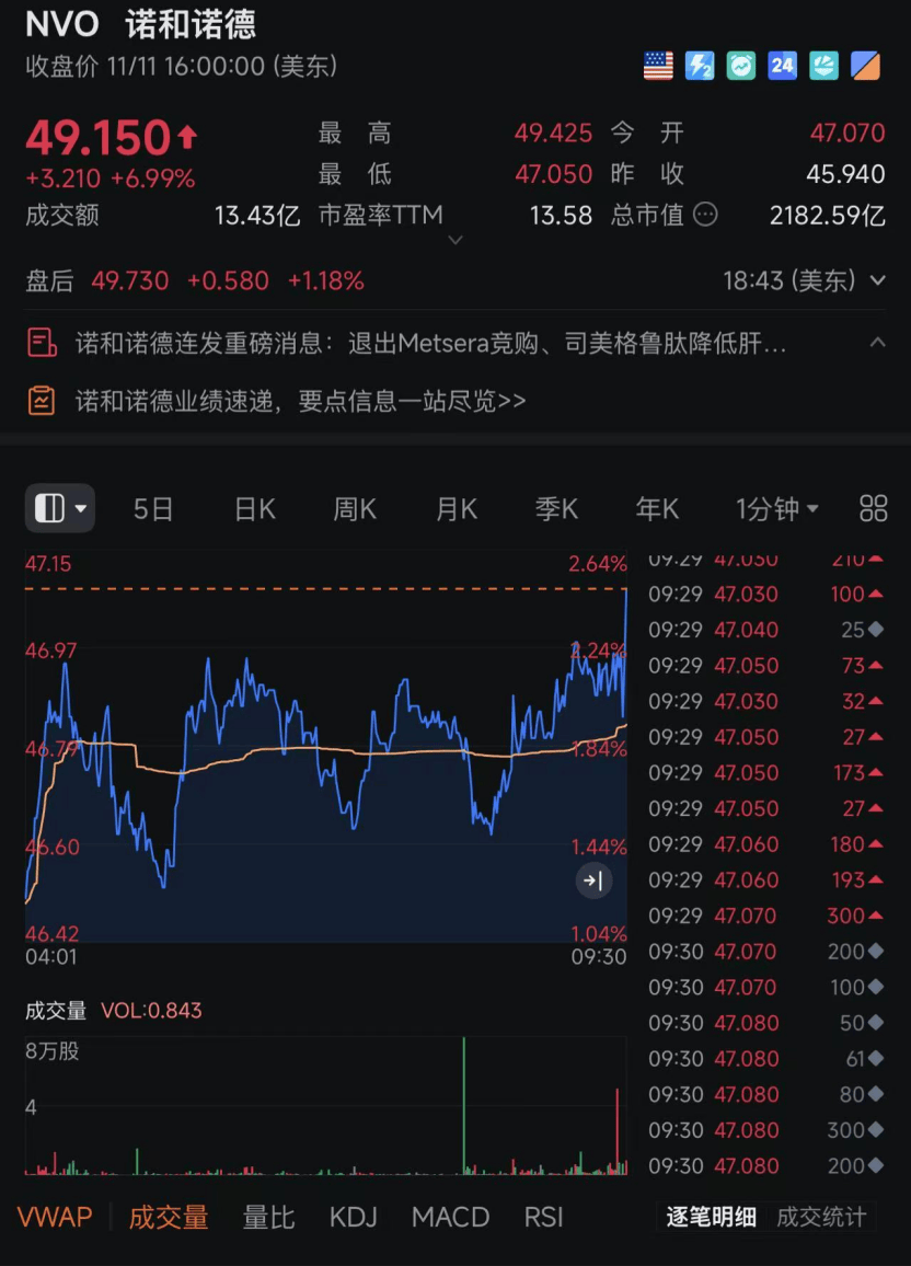 个股方面,诺和诺德美股涨近7%。公司旗下实验性药物coramitug(前身为“PRX004”)的Ⅱ期临床试验数据在美国心脏协会科学年会上公布,同时发表在美国心脏协会杂志《循环》上。