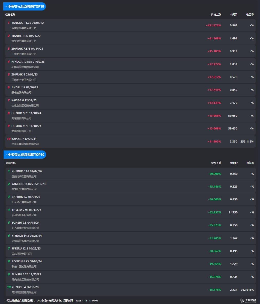 11月11日,中资美元债涨跌幅榜TOP10如下: