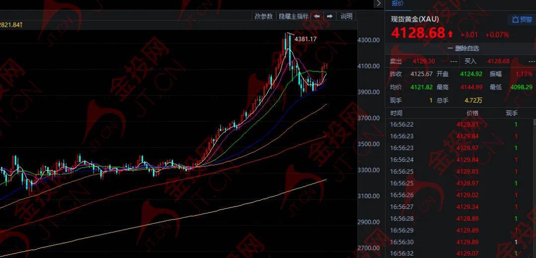 隔夜,现货黄金上涨0.27%,收报4126.62美元,盘中最高触及4148.91美元,创下10月23日以来新高。今日欧市盘中,黄金窄幅震荡,目前在4129美元附近徘徊。