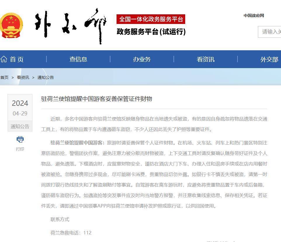 极目新闻记者注意到,2024年4月,中国驻荷兰使馆就曾发出公告,提醒中国游客旅游时妥善保管个人证件和财物。