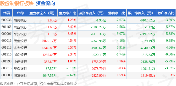 从资金流向上来看,当日股份制银行板块主力资金净流入6.81亿元,游资资金净流出3.22亿元,散户资金净流出3.6亿元。股份制银行板块个股资金流向见下表: