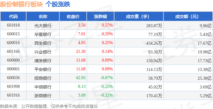 证券之星消息,11月12日股份制银行板块较上一交易日上涨0.04%,光大银行领涨。当日上证指数报收于4000.14,下跌0.07%。深证成指报收于13240.62,下跌0.36%。股份制银行板块个股涨跌见下表: