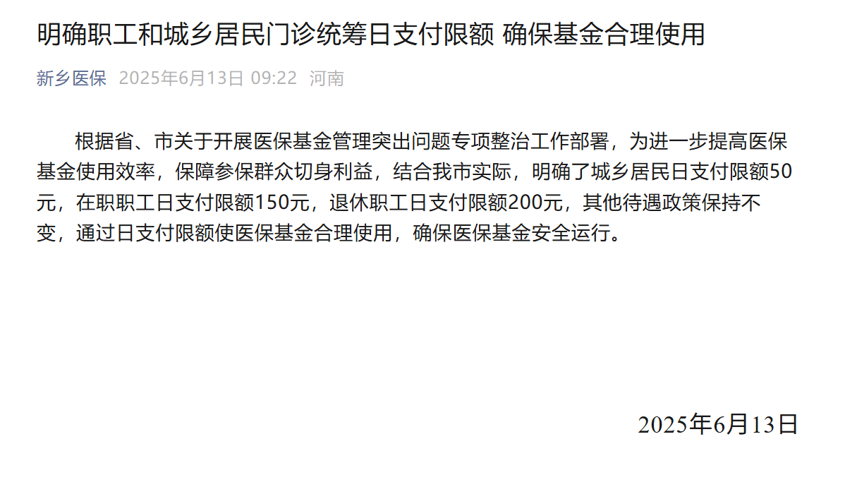 所谓“限额”,来自新乡市医保局在今年6月发布的一项新规——以日为单位,对该区域内城乡居民、在职职工、退休职工的医保门诊统筹支付划定限额,每日最高限额为50元、150元、200元。