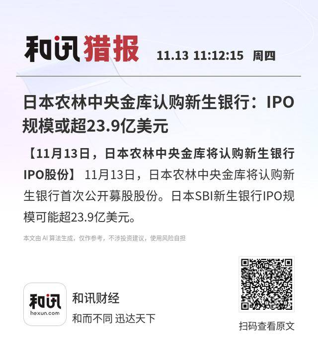 【11月13日,日本农林中央金库将认购新生银行IPO股份】11月13日,日本农林中央金库将认购新生银行首次公开募股股份。日本SBI新生银行IPO规模可能超23.9亿美元。