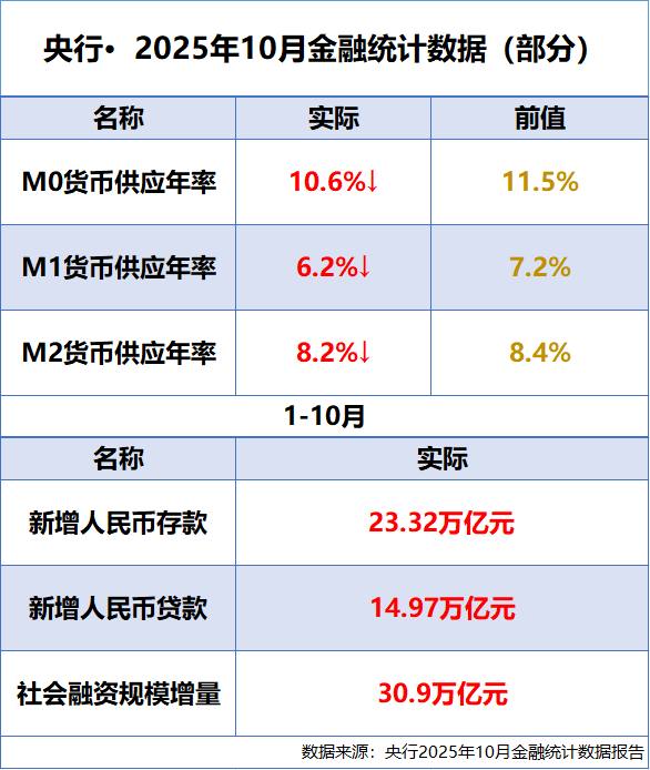 钛媒体App 11月13日消息,央行2025年10月金融数据报告出炉。10月末,M2余额335.13万亿元,同比增长8.2%,较上月下降0.2个百分点。M1余额112万亿元,同比增长6.2%,较上月下降1个百分点。M0同比增长10.6%。2025年前十个月社会融资规模增量累计为30.9万亿元,比上年同期多3.83万亿元。前十个月人民币存款增加23.32万亿元;人民币贷款增加14.97万亿元。10月末,M1-M2剪刀差为-2%,较上月-1.2%略有波动,但仍较去年9月收窄8.1个百分点,表明更多资金转化为活期存款,反映出企业生产经营活跃度提升、个人投资消费需求回暖等积极信号。(广角观察)