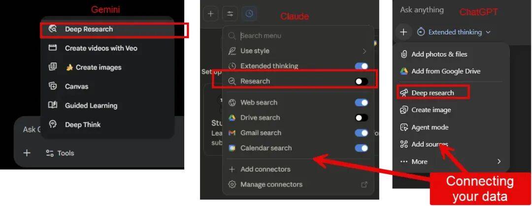 上图展示如何开启「Deep Research」深度研究模式,以及如何将个人数据连接到Claude与ChatGPT,实现AI对邮箱、文档、日程等信息的自动整合。