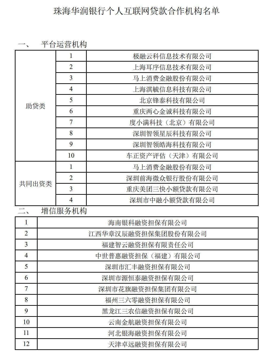 此前,珠海华润银行采取“项目制”白名单,细化合作边界。而在9月16日助贷新规即将实施之际,该行重新披露了个人互联网贷款合作机构名单。名单显示,该行合作机构主要分为平台运营机构与增信服务机构。其中,平台运营机构包括马上消金、度小满等“助贷类”机构以及前海微众银行、重庆美团三快小贷公司等“共同出资类”机构。