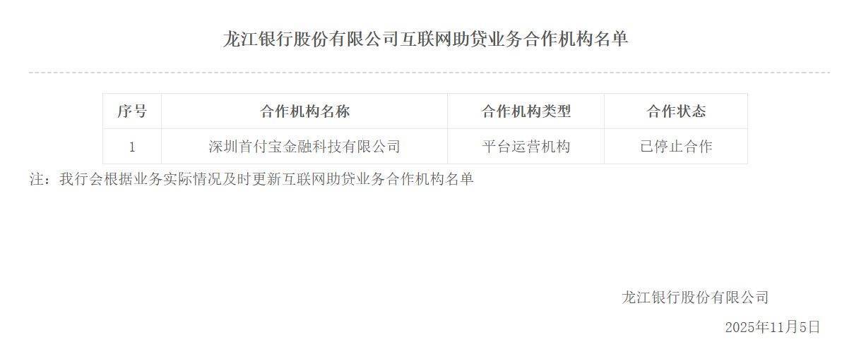 11月5日,龙江银行虽按新规要求公布了合作机构名单,但名单中唯一的助贷机构的状态标注为“已停止合作”。