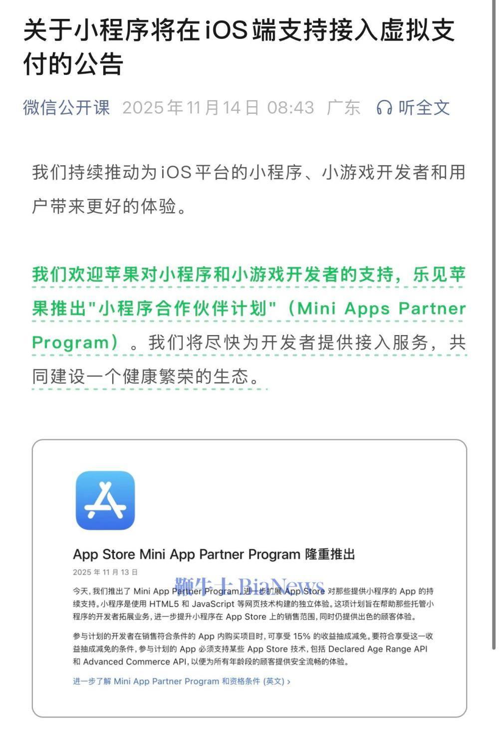 我们欢迎苹果对小程序和小游戏开发者的支持,乐见苹果推出"小程序合作伙伴计划"(Mini Apps Partner Program)。我们将尽快为开发者提供接入服务,共同建设一个健康繁荣的生态。