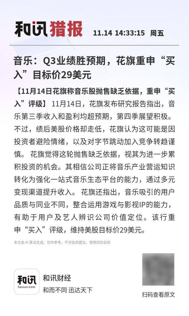 【11月14日花旗称音乐股抛售缺乏依据,重申“买入”评级】11月14日,花旗发布研究报告指出,音乐第三季收入和盈利均超预期,第四季展望积极。不过,绩后美股价格却走低,花旗认为这可能是因投资者避险情绪,以及对字节跳动加入竞争转趋谨慎。 花旗觉得这轮抛售缺乏依据,视其为进一步累积投资的机会。其相信公司正将音乐产业营运知识转化为强化一站式音乐生态平台的能力,通过多元变现渠道提升收入。 花旗还指出,音乐吸引的用户品质与同业不同,整合运用游戏与影视IP的能力,有助于用户及艺人辨识公司价值定位。该行重申“买入”评级,维持美股目标价29美元。