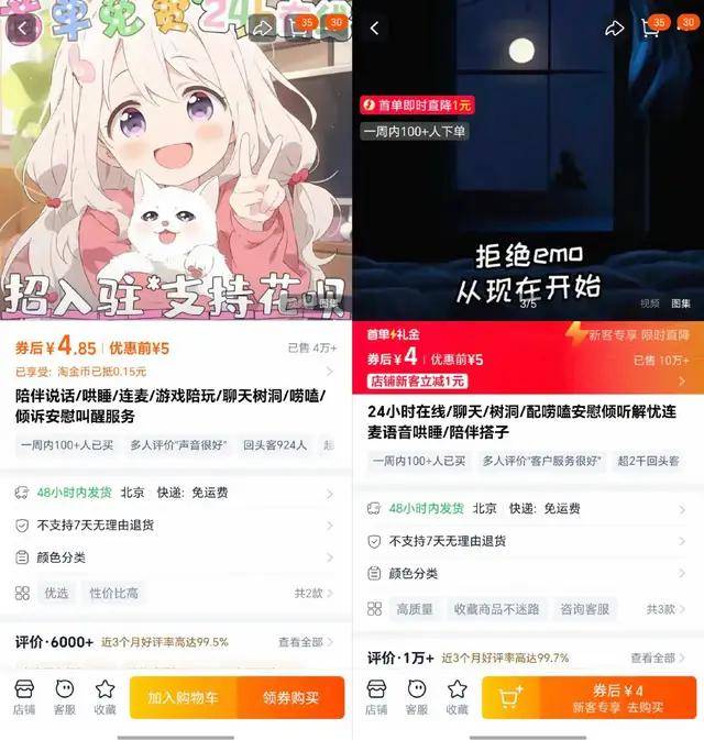 在线上,各类提供情感陪伴的服务悄然兴起。在某语音社交平台上,付费陪聊服务每小时收费50-200元不等,其中“情感疏导”、“树洞倾听”是最受欢迎的项目。在淘宝网上,陪伴说话/哄睡/聊天等产品多种多样,排名靠前的商家已经售出数万单,获得了10000+的评价。