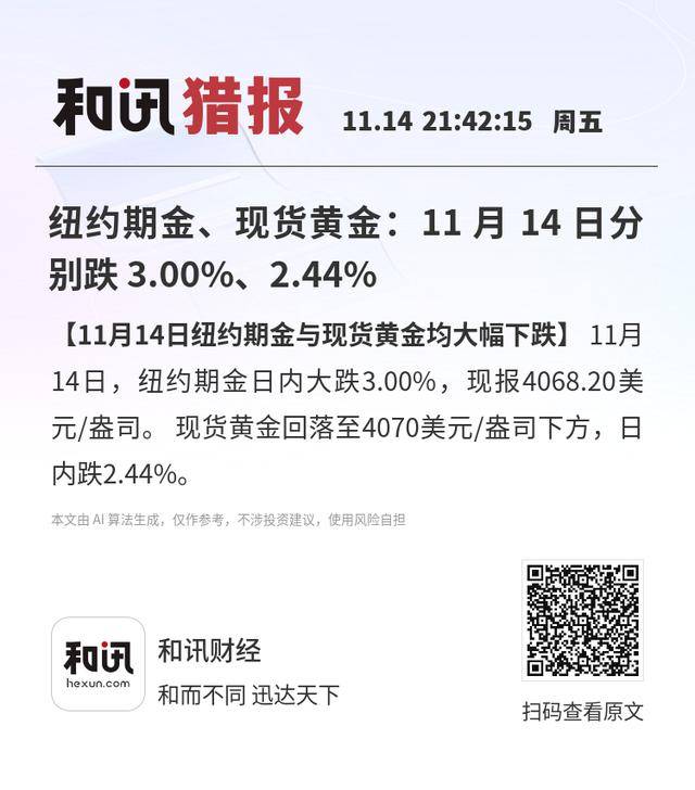 【11月14日纽约期金与现货黄金均大幅下跌】11月14日,纽约期金日内大跌3.00%,现报4068.20美元/盎司。 现货黄金回落至4070美元/盎司下方,日内跌2.44%。