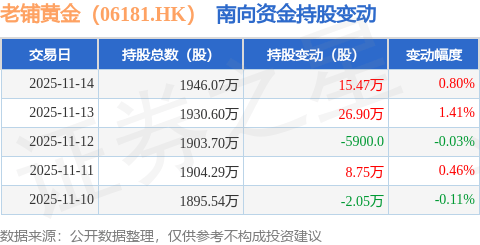证券之星消息,11月14日南向资金增持15.47万股老铺黄金(06181.HK)。近5个交易日中,获南向资金增持的有3天,累计净增持48.48万股。近20个交易日中,获南向资金增持的有11天,累计净增持13.09万股。截至目前,南向资金持有老铺黄金(06181.HK)1946.07万股,占公司已发行普通股的13.58%。