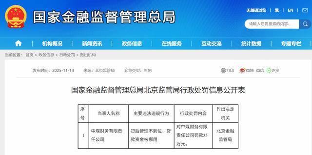 据国家金融监督管理总局官网,国家金融监督管理总局北京监管局11月14日披露的行政处罚信息公开表显示,因贷后管理不到位,贷款资金被挪用,中煤财务有限责任公司被罚款35万元。