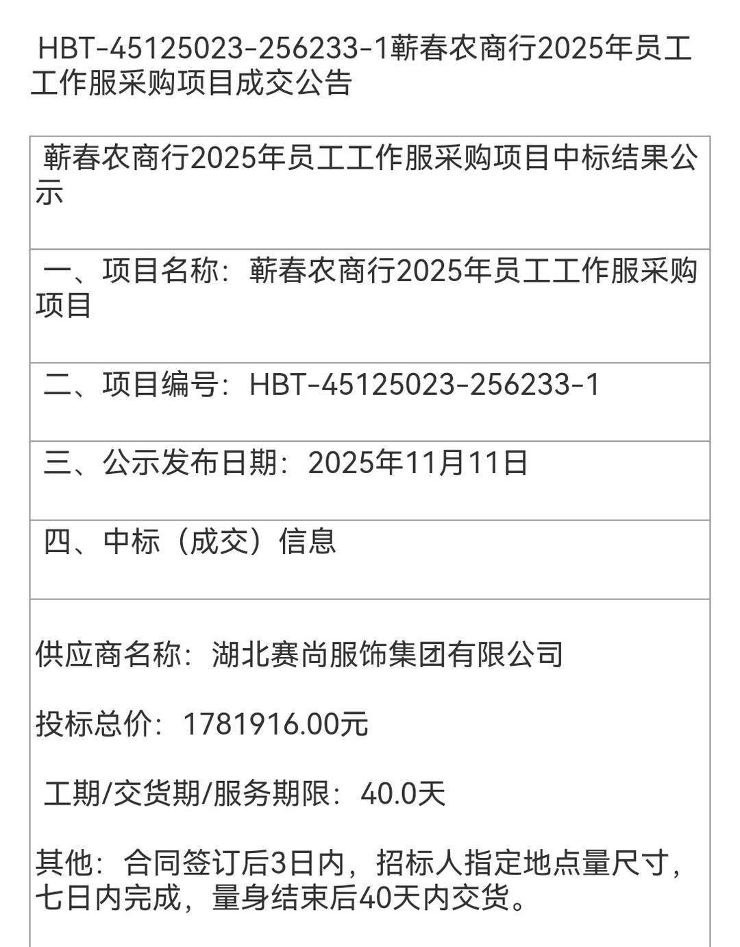 其二, 为什么同一家企业多次中标,有无利益勾兑?报道称,这次是湖北赛尚服饰集团有限公司以178.2万元的报价中标,在2024年、2022年曾分别以114.2万元、68.3万元中标该行工作服采购项目。值得追问的是,到底是这家公司的服装物美价廉,给了“熟人优惠价”,还是暗藏回扣等利益输送?这些问题也有必要查清楚。