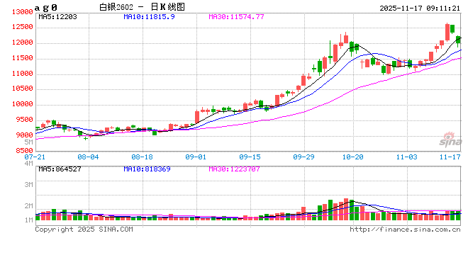 2025年11月17日,早盘开盘,国内主力合约涨跌不一。沪银跌超3%,沪金、跌超2%,氧化、沪锡、玻璃跌超1%;涨幅方面,集运指数(欧线)涨超6%,、苯乙烯(EB)涨超1%,低硫(LU)涨近1%。