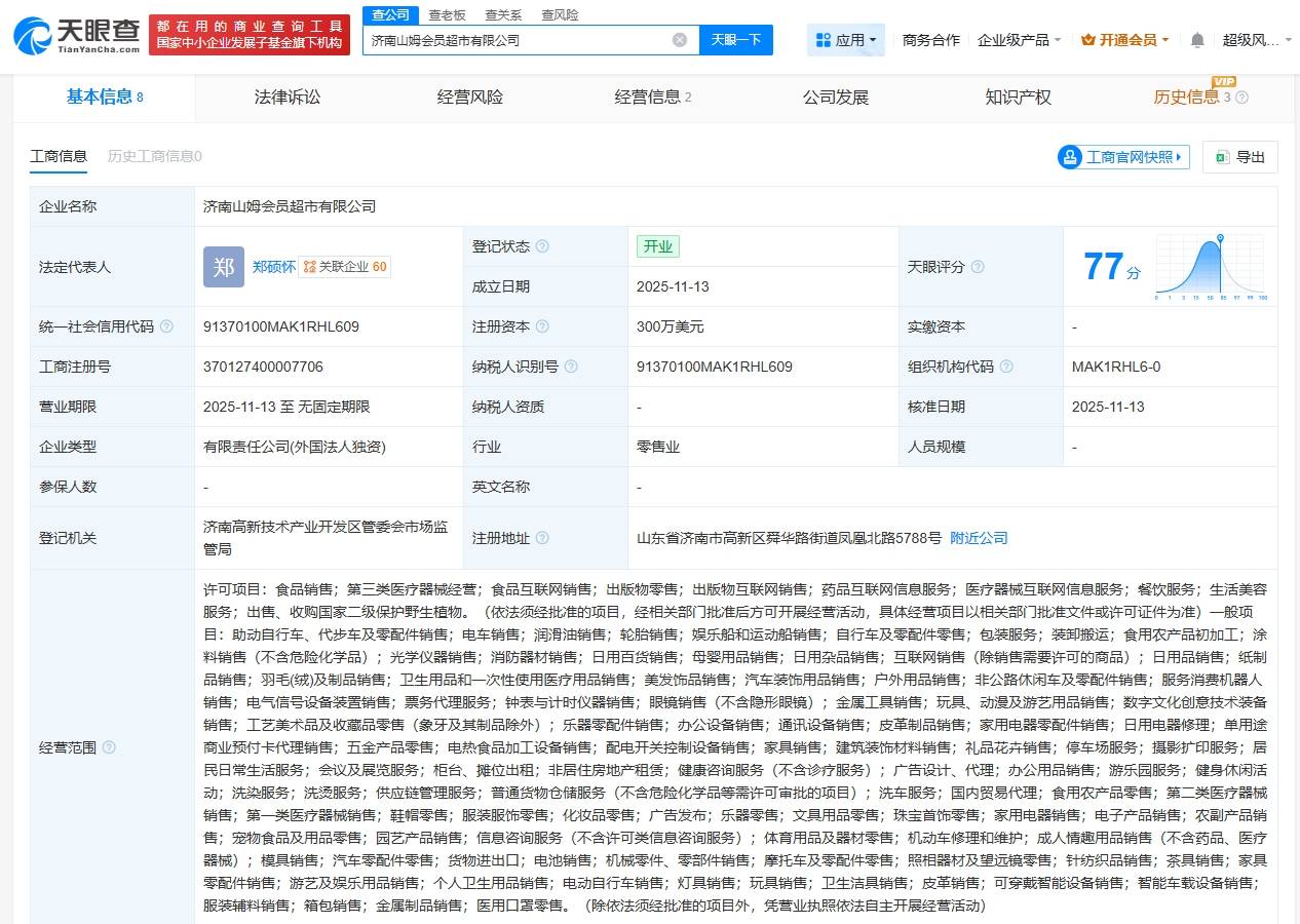 天眼查App显示,近日,济南山姆会员超市有限公司成立,法定代表人为郑硕怀,注册资本300万美元,经营范围包括食品销售、第三类医疗器械经营、食品互联网销售、出版物零售等。股东信息显示,该公司由山姆(上海)投资有限公司全资持股。